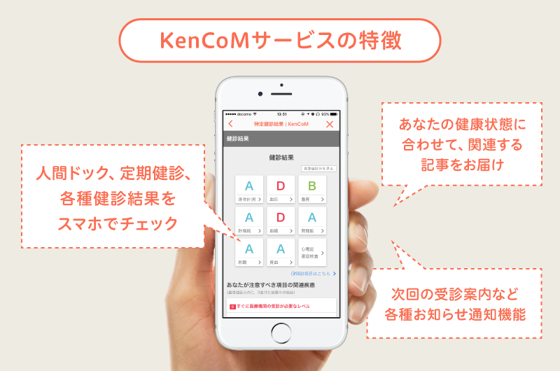 セントラルクリニックグループ様では、①受診者様向けサービス品質の向上、②健診結果の「KenCoM」での通知による費用削減、③受診者様のリピートの促進を目的に、運営する4施設での全ての健診受診者を対象にKenCoMサービスが提供されます。